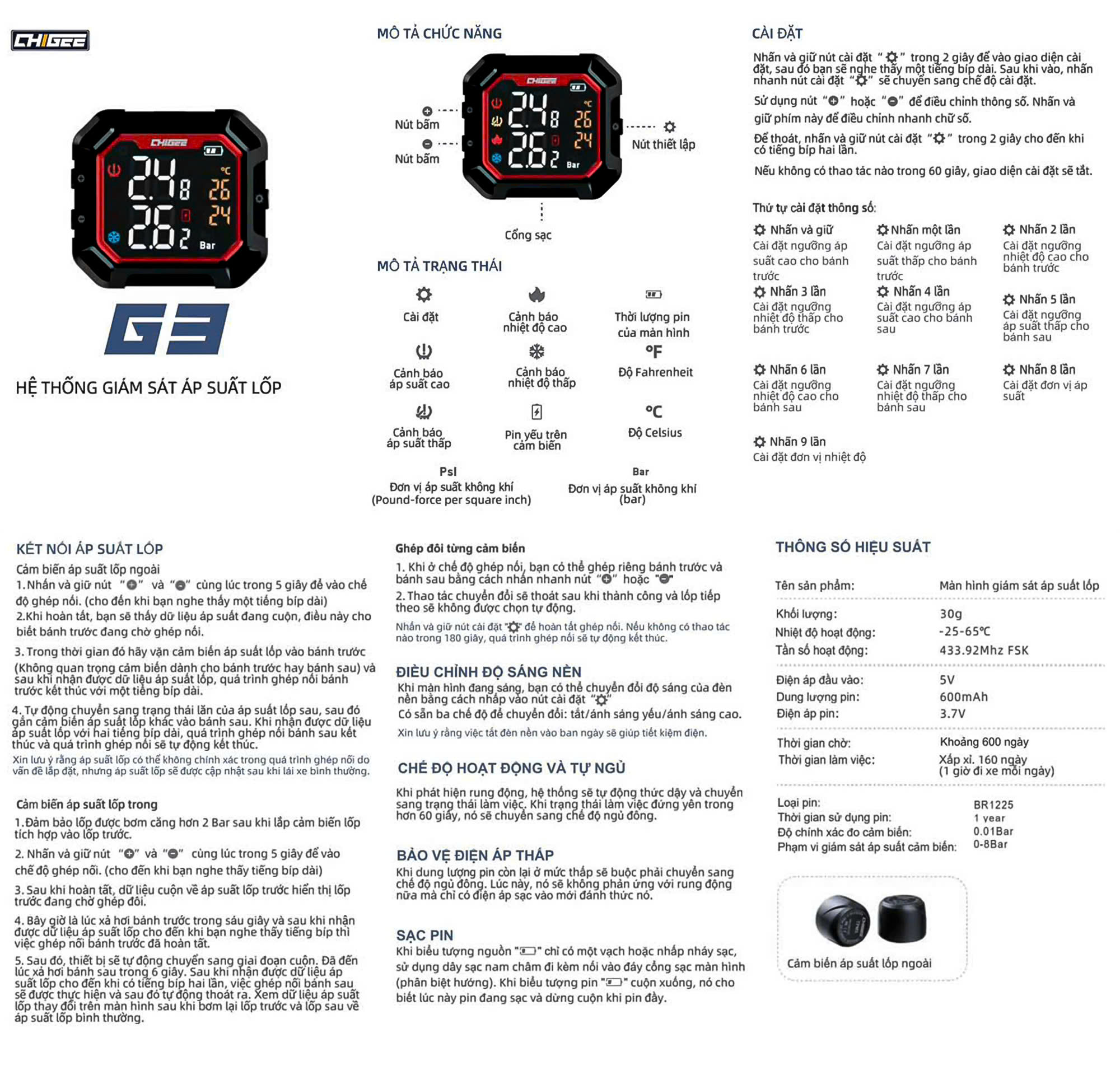 Đồng hồ cảm biến áp suất lốp Chigee G3 chính hãng