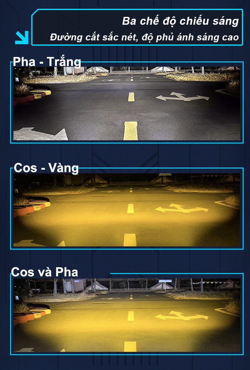 -Nhiệt độ màu : pha trắng 6000K , cos vàng 2800K, pha + cos 4000K