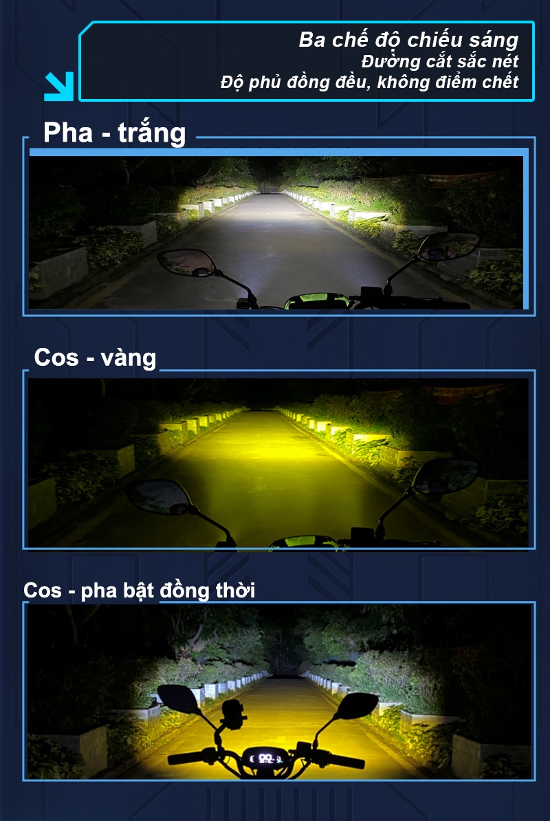-Nhiệt độ màu : pha trắng 6000K, cos vàng 2800K, pha + cos 4000K