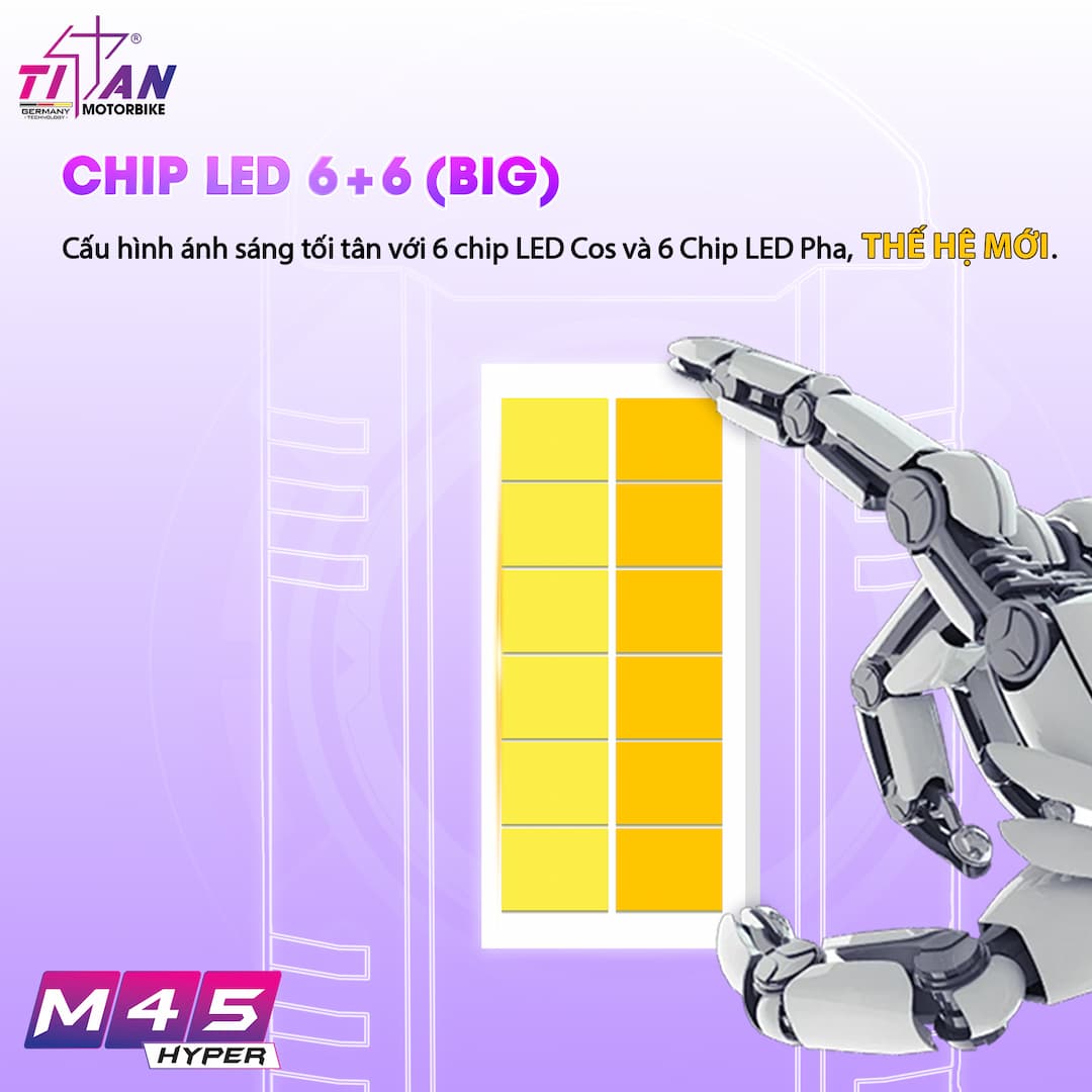 Đặc biệt, chip LED trong đèn trợ sáng M45 Hyper được thiết kế đột phá khi cả 6 chip LED trên và dưới đều phân bổ nằm ngang. Cách phân bổ chip LED này góp phần tăng góc sáng của sản phẩm, có thể đạt được hiệu quả chiếu sáng lên đến 2 - 3 làn đường, mang lại tầm nhìn toàn diện và rõ nét cho người lái.