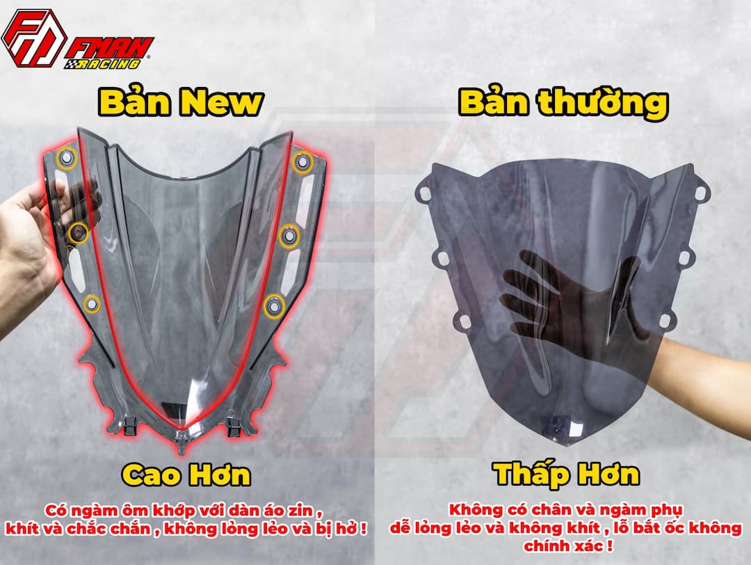 Được thiết kế có ngàm khớp với dàn áo zin nên rất khít và chắc chắn hơn các loại khác , không bị hở & lỏng lẻo khi lắp đặt! -Phiên bản kính chắn gió R15V4 /R15M chính hãng mới (mẫu B) được thiết kế dày dặn hơn, và bền hơn được rất nhiều ae lựa chọn lên xe!
