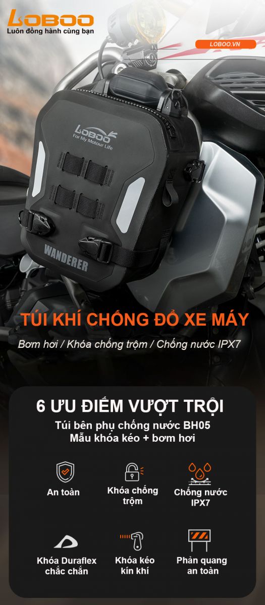 Mẫu BH05 sử dụng khóa chống trộm, Ae có thể cố định khóa theo nhiều vị trí khác nhau, bơm hơi bằng tay giúp cho túi luôn căng đẹp.